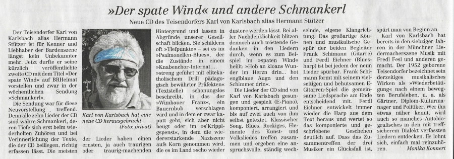 Eines steht fest: ... Ein Album zum Nebenherhorchen ist „DER SPATE WIND" nicht. Da muss man zuhören, am besten noch die Texte im Booklet mitlesen, Denn die Lieder des Teisendorfers Karl von Karlsbach alias Hermann Stützer sind Poesie, von der man sich kein Wort entgehen lassen sollte.
